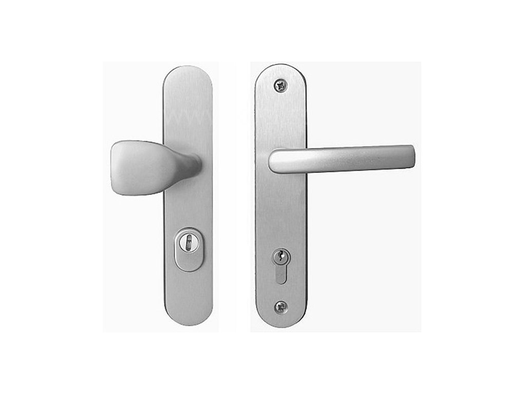 Bezpečnostní kování rozteč 90 madlo-klika, přírodní hliník, krytka zámku