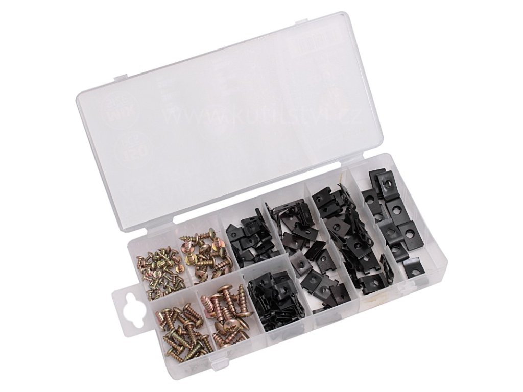 Praktická servisní sada pro rychlé opravy a montáž karosářských komponentů a příslušenství ve vozidlech.Použití:- Montáž a servis dílů karoserie: podběhy kol, kryty motoru, lišty a kliky, malé vnitřní spojovací prvky.- Výměna chybějících šroubů a podložek po demontáži nebo opravách karoserie a servisu.- Eliminace vůle a vibrací výběrem vhodného průměru šroubu a použitím správné podložky.- Mobilní a dílenské použití: rychlé nouzové opravy, praktická sada v servisním vozidle.Složení sady:- Šroub M3 x 8 mm – 40 ks- Šroub M4 x 16 mm – 20 ks- Šroub M5 x 12 mm – 15 ks- Šroub M6 x 20 mm – 20 ks- Podložka M3 – 20 ks- Podložka M4 – 20 ks- Podložky M3 – 20 ks- Podložky M5 – 15 ks- Podložky M6 – 10 ks- Velikosti součástí: M3, M4, M5, M6; délky šroubů: 8–20 mm