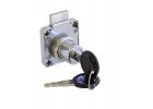 Celokovový zásuvkový zámek galvanicky pokovený, dodávaný v krabičce včetnědvou kusů cylindrických klíčků. Rozměry: délka 40 mm, šířka 30 mm, výška 40 mm